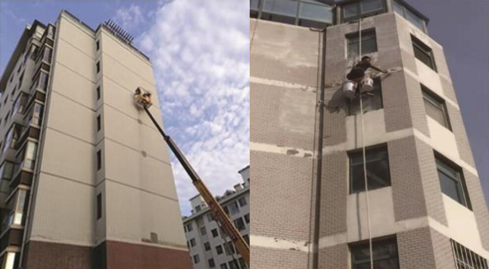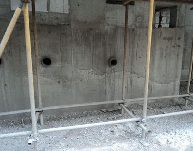 ( 3 )墻體孔洞處理和檢查:混凝土剪力墻上的螺桿孔應四周鑿成喇叭口,用膨脹水泥砂漿塞滿,再用聚合物防水漿封口,封堵嚴密。抹灰前應檢查墻體孔洞,封堵如墻身的各種孔洞,不平整處用1 : 3水泥砂漿找平,如遇太厚處,應掛鋼筋網或分層找平,粘結布等批灰,另對塔吊、腳手架、施工電梯的拉結桿等在外墻留下的洞口應清潔潤,用素水泥漿掃漿充分,再用干硬性砼分2次各半封堵,充分搗固密實,水落管卡子鉆孔向下傾斜3°-5° ,卡釘套膨脹膠管刷環氧樹脂嵌入,嚴禁使用木楔。