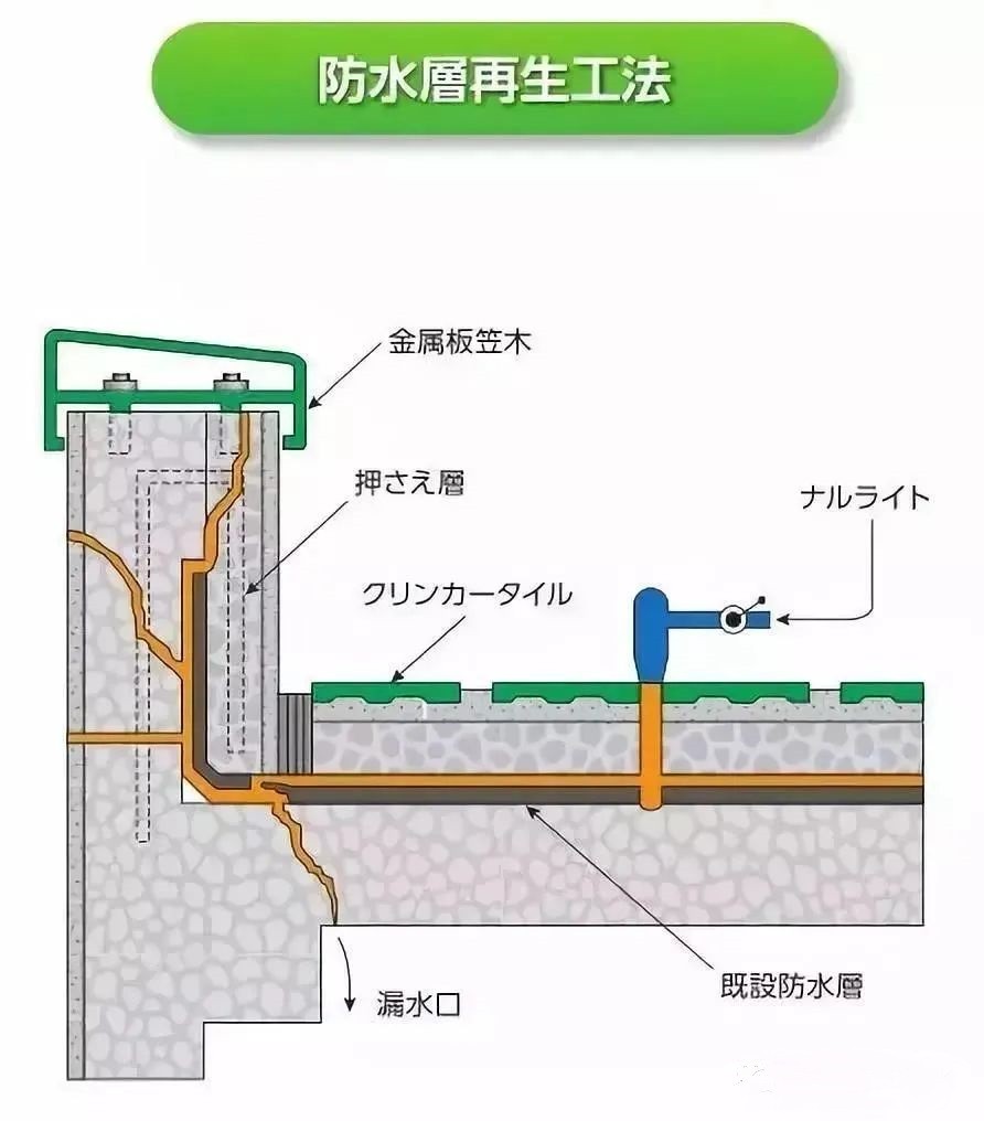 防水層再生工法,顧名思義就是在已有防水層和混凝土保護(hù)層之間注入填充材料形成一層新的密封層,從而達(dá)到止水目的。