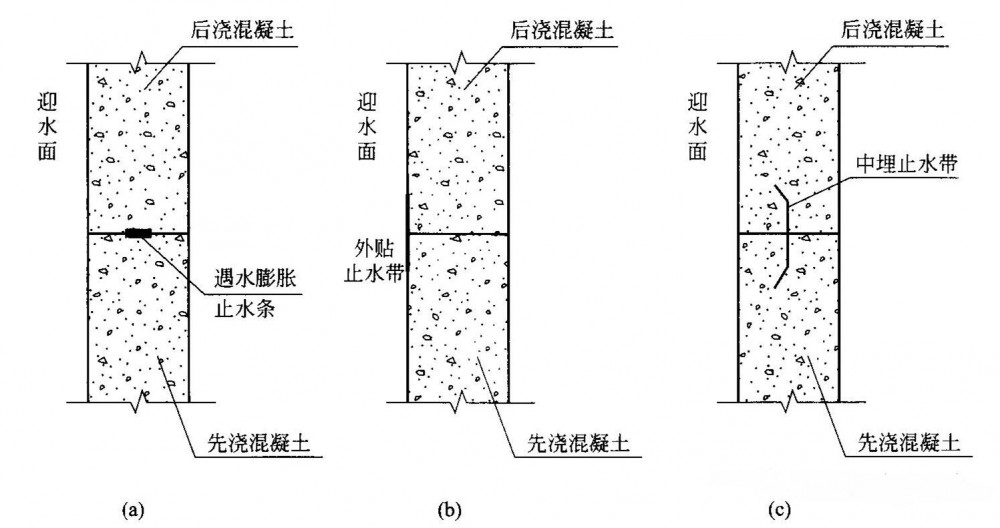 施工縫處通常設置止水帶、膨脹止水條等構造措施進行防水。根據止水帶安放的位置不同,施工縫防水構造主要有外貼式止水帶和中埋式止水帶兩類。對新舊混凝土界面進行界面處理。圖1(a)與圖1(c)屬于中埋式防水構造,圖1(b)屬于外貼式防水構造。