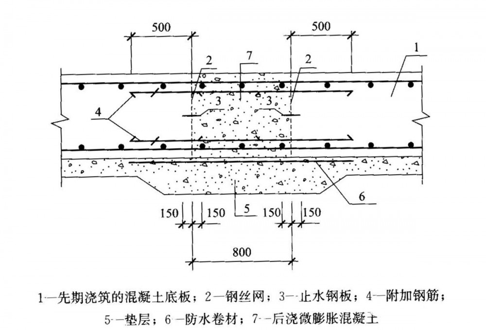 施工縫指在混凝土澆筑過程中,因設計要求或施工需要分段澆筑,而在先、后澆筑的混凝土之間所形成的接縫。施工縫并不是一種真實存在的“縫”,它只是因先澆筑混凝土超過初凝時間,與后澆筑的混凝土之間存在一個結合面,該結合面就稱之為施工縫,又稱之為“冷接縫”。而后澆帶設置主要解決超長結構因自身收縮過大或兩側結構荷載差異大、變形大而采取的臨時分段措施。施工縫(后澆帶)位于建筑結構施工接槎處,處理不好很容易產生滲漏水,因此在實際施工中最好不留或少留施工縫,但由于受到支模及施工條件或混凝土無法一次澆筑完等限制,在大型建筑工程中留設施工縫(后澆帶)的做法較為普遍。