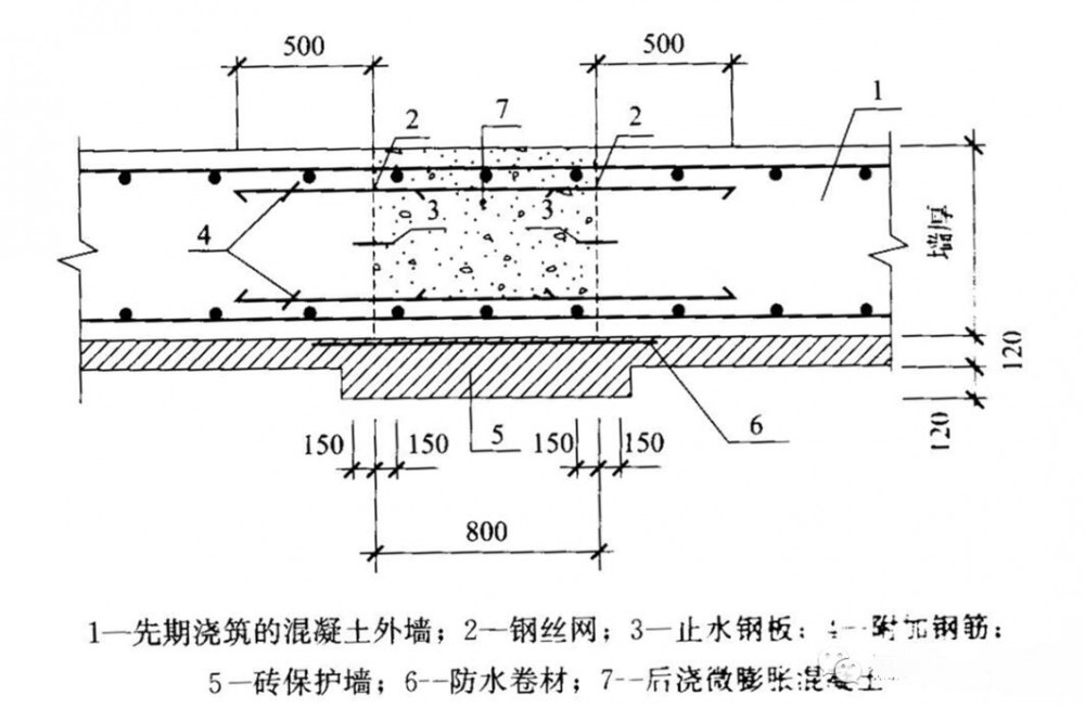 目前對施工縫處的防水處理一般采用楔口縫、平口縫、階梯縫或者止水帶(緩膨型橡膠止水帶)、止水鋼板等構造防水方法,詳細的具體做法可參考有關建筑工程設計和施工的標準和要求。