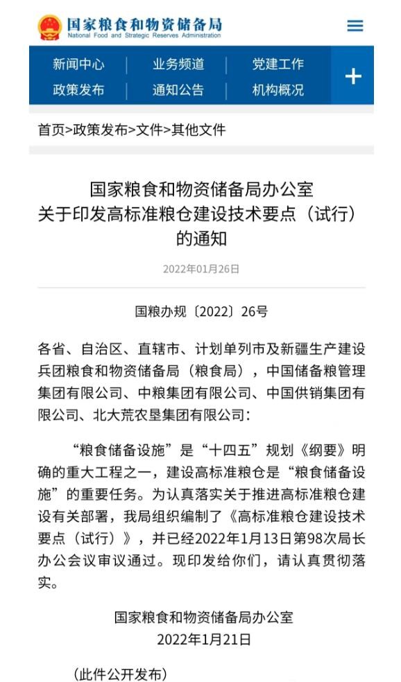 2022年1月21日,國家糧食和物資儲(chǔ)備局發(fā)布《高標(biāo)準(zhǔn)糧倉建設(shè)技術(shù)要點(diǎn)(試行)》的通知。該要點(diǎn)明確了高標(biāo)準(zhǔn)糧倉建設(shè)的總體要求、倉房建筑、接發(fā)與儲(chǔ)糧工藝、電氣與自控、信息化系統(tǒng)與綜合布線等內(nèi)容,為高標(biāo)準(zhǔn)糧倉建設(shè)項(xiàng)目的咨詢、設(shè)計(jì)提供依據(jù),對(duì)高標(biāo)準(zhǔn)糧倉倉房建筑圍護(hù)結(jié)構(gòu)的保溫、防水做出了明確的要求和規(guī)定。